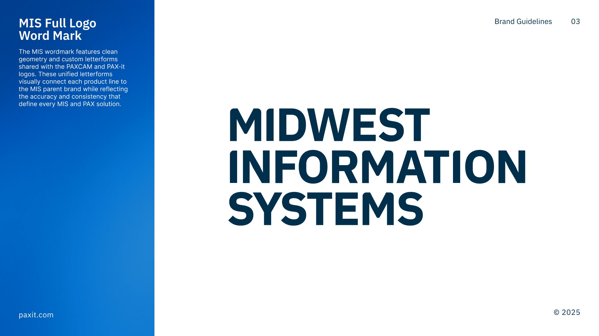 This is the visual identity and brand system created for Midwest Information Systems, a precision imaging company serving medical, scientific, and manufacturing industries. The goal of this project was to established a unified brand architecture across the parent company and its two product brands — PAXIT, an image analysis software platform, and PAXCAM, an imaging hardware line. New logos and brand guidelines were designed to work as a cohesive system, communicating accuracy, reliability, and technical expertise while clearly defining each brand’s role within a connected imaging ecosystem.